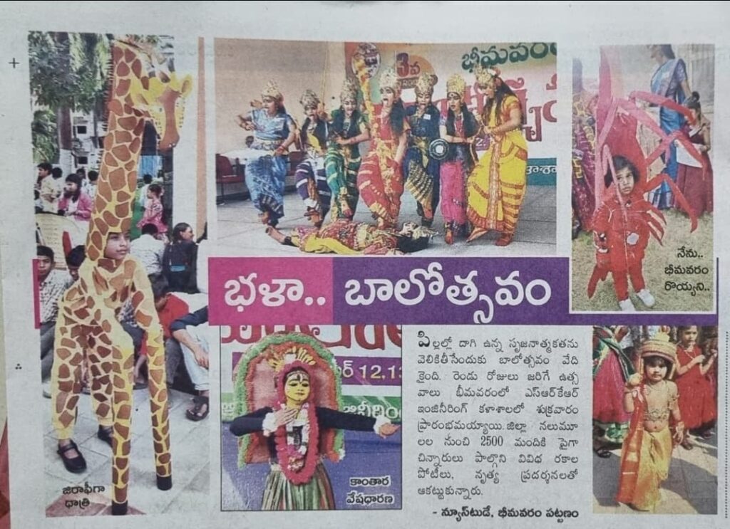 భీమవరం, పశ్చిమ గోదావరి జిల్లా లోని ఎస్ఆర్కేఆర్ ఇంజినీరింగ్ కాలేజీ ప్రాంగణంలో ఘనంగా నిర్వహించిన భలే – బాలోత్సవం కార్యక్రమం విద్యార్థుల ఉత్సాహంతో సందడిగా సాగింది. ఈ బాలోత్సవంలో సుమారు 2500 మంది విద్యార్థులు పాల్గొని తమ కళా, సాంస్కృతిక ప్రతిభను అద్భుతంగా ప్రదర్శించారు. కళాశాల మొత్తం బాలల ఆనందోత్సాహాలతో కళకళలాడింది.