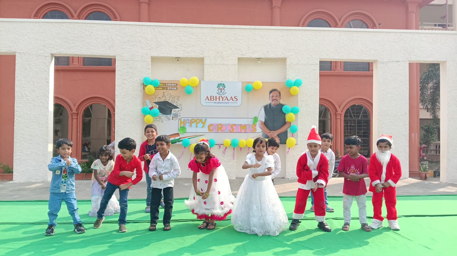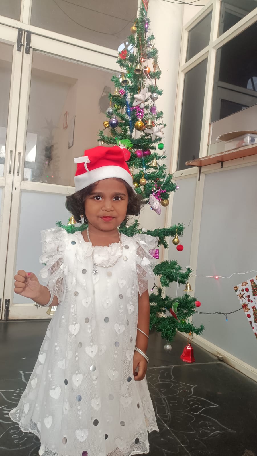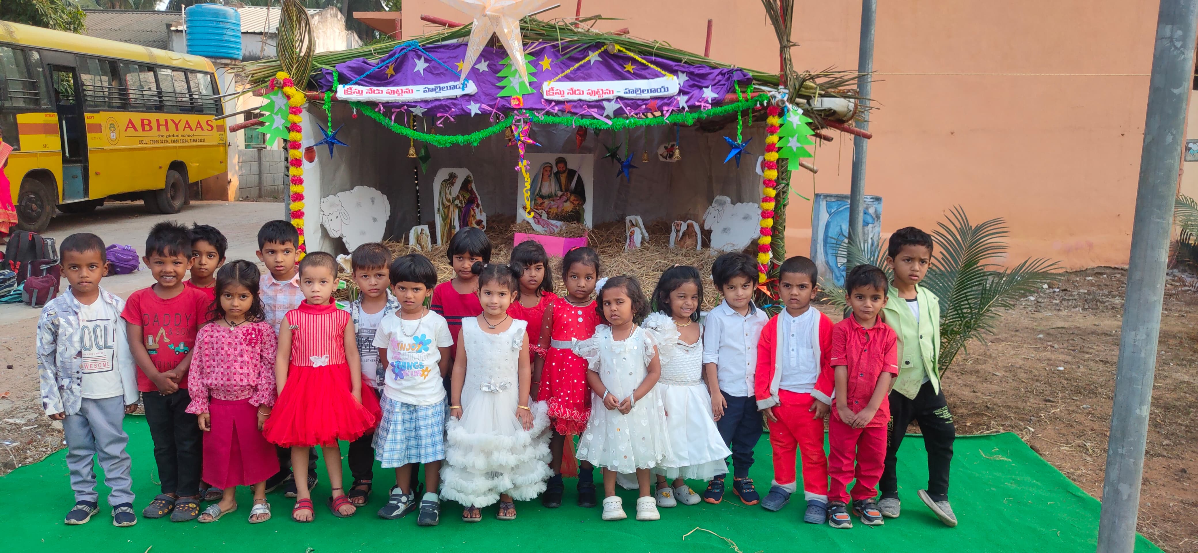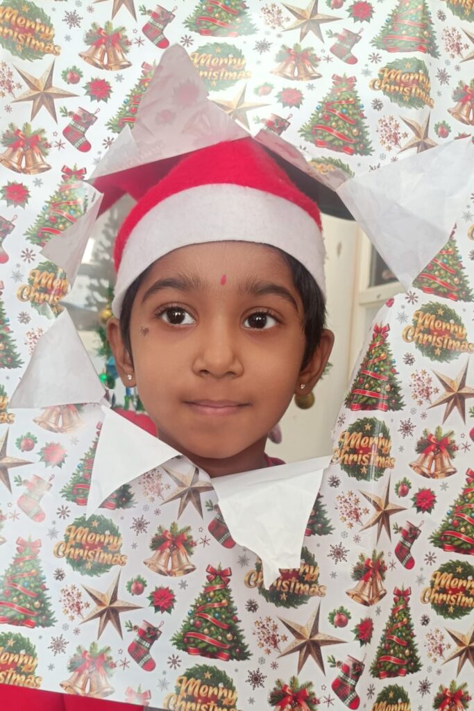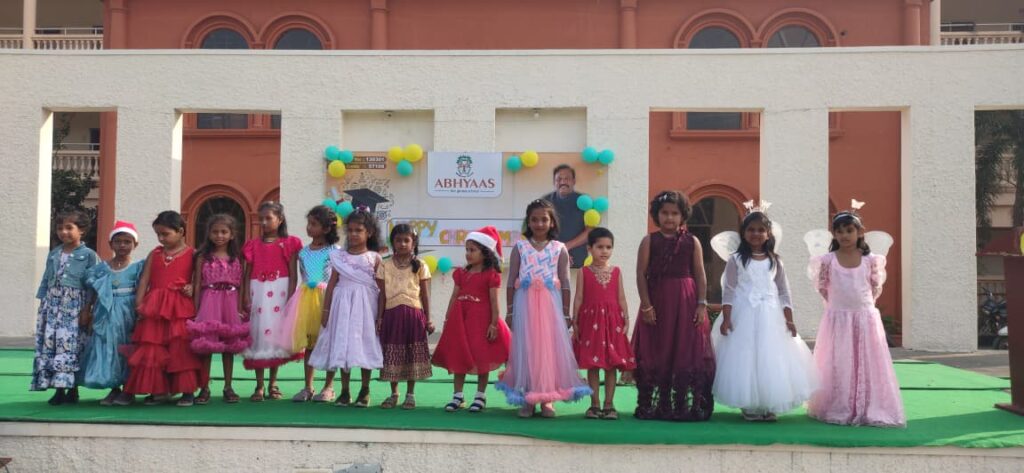 Pre-primary students came dressed as Santa Claus and gave an energetic dance performance for the song “Jingle Bells.” They also performed dances for songs like “Jangamantha Sambarame,” “Ningilona Tara Velisenu,” and “Feliz Navidad,” which filled the atmosphere with happiness and festive spirit.